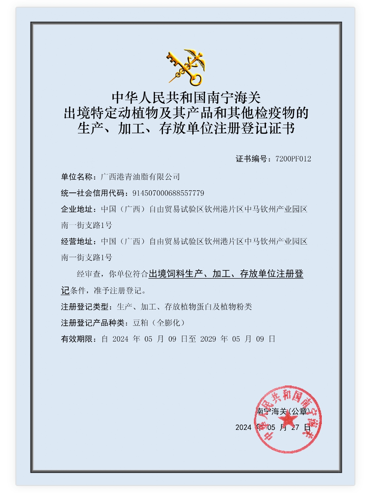 5月27日,港青油脂獲得“中華人民共和國南寧海關(guān)出境特定動植物及其產(chǎn)品和其他檢疫物的生產(chǎn)、加工、存放單位注冊登記證書”。